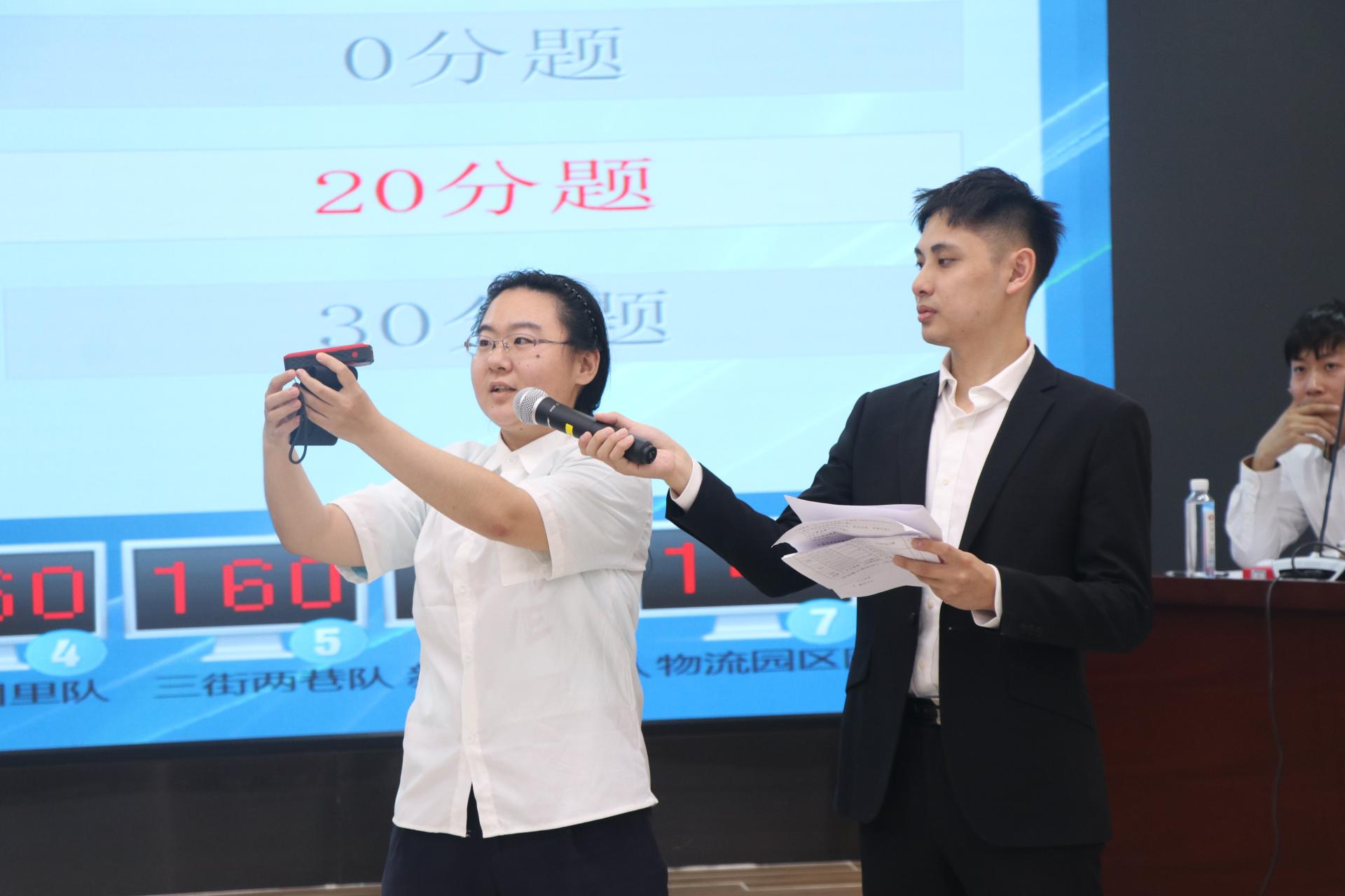 比赛过程中,各支参赛队伍神情专注、沉着应答、奋勇争先,现场不仅有工程建设领域等专业知识题型,还有水平仪,测距仪,空鼓锤各种仪器的技能实操,选手们既是现场答题者,又是仪器的讲解者和操作者,将个人娴熟的业务技能和敏捷的身手展现出来。随着抢答题和风险题环节的深入进行,赛场的气氛更加白热化,得分交替领先,现场高潮迭起、扣人心弦,队员在答题中的出色表现,不时赢得场下观众的掌声与欢呼声。经过激烈角逐,最后由乐虎游戏首府项目代表队斩获比赛一等奖。